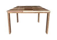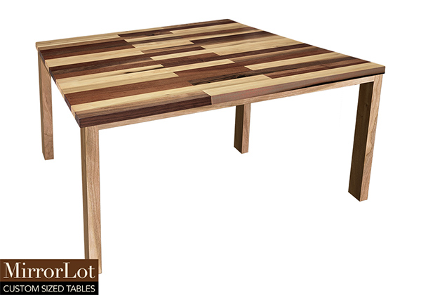 This mixed wood table is a combination natural mahogany, walnut, and poplar. It displays a contemporary design with a rustic flair. It is square, but can be customized to your desired shape and size. The square shape table top is made from solid walnut, mahogany, poplar wood and the table legs are