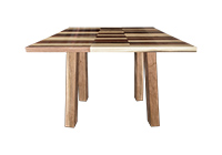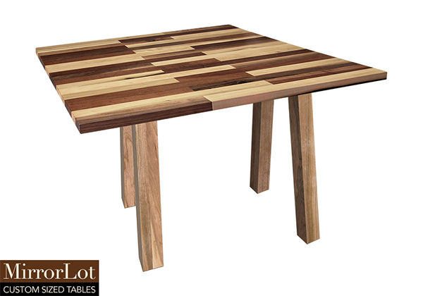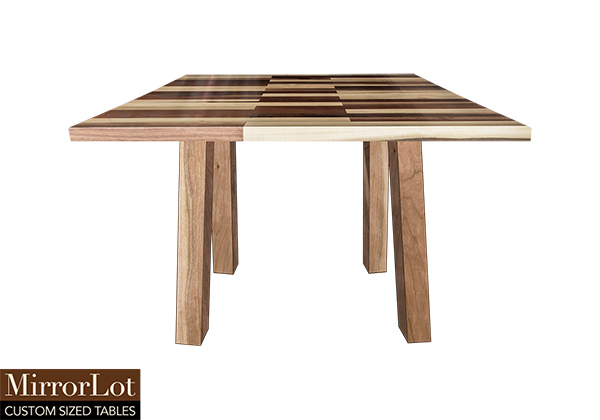 This mixed wood table is a combination natural mahogany, walnut, and poplar. It displays a contemporary design with a rustic flair. It is square, but can be customized to your desired shape and size. The square shape table top is made from solid walnut, mahogany, poplar wood and the table legs are