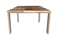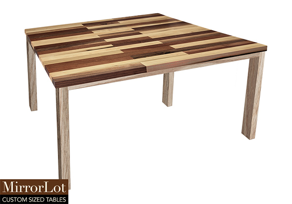 This mixed wood table is a combination natural mahogany, walnut, and poplar. It displays a contemporary design with a rustic flair. It is square, but can be customized to your desired shape and size. The square shape table top is made from solid walnut, mahogany, poplar wood and the table legs are