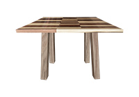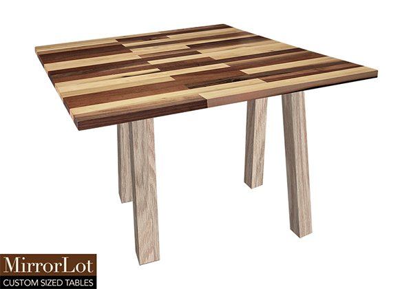 This mixed wood table is a combination natural mahogany, walnut, and poplar. It displays a contemporary design with a rustic flair. It is square, but can be customized to your desired shape and size. The square shape table top is made from solid walnut, mahogany, poplar wood and the table legs are
