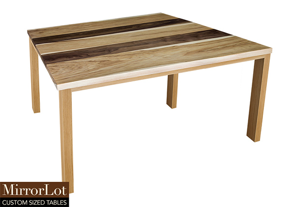 This natural walnut and pecan hickory table brings rustic charm to any room in your house. It is a square table, but can be customized to your desired shape and size. The square shape table top is made from solid walnut, pecan hickory wood and the table legs are