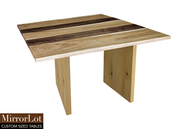 This natural walnut and pecan hickory table brings rustic charm to any room in your house. It is a square table, but can be customized to your desired shape and size. The square shape table top is made from solid walnut, pecan hickory wood and the table legs are