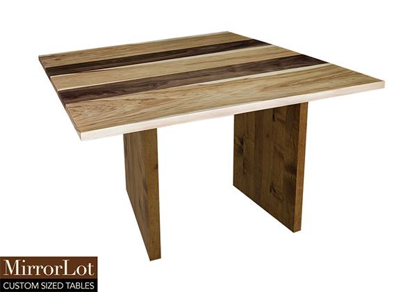 This natural walnut and pecan hickory table brings rustic charm to any room in your house. It is a square table, but can be customized to your desired shape and size. The square shape table top is made from solid walnut, pecan hickory wood and the table legs are