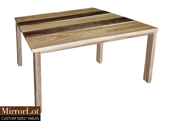 This natural walnut and pecan hickory table brings rustic charm to any room in your house. It is a square table, but can be customized to your desired shape and size. The square shape table top is made from solid walnut, pecan hickory wood and the table legs are