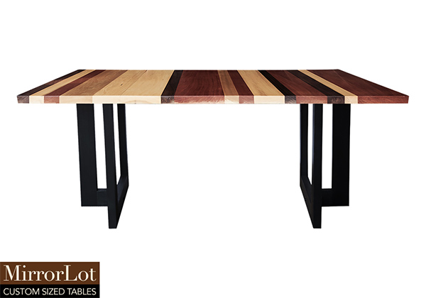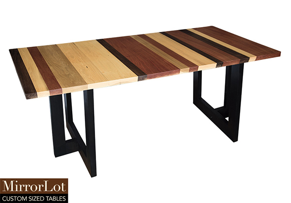 Wood & finish: Stripes of natural walnut, mahogany, and poplar table top and black table legs