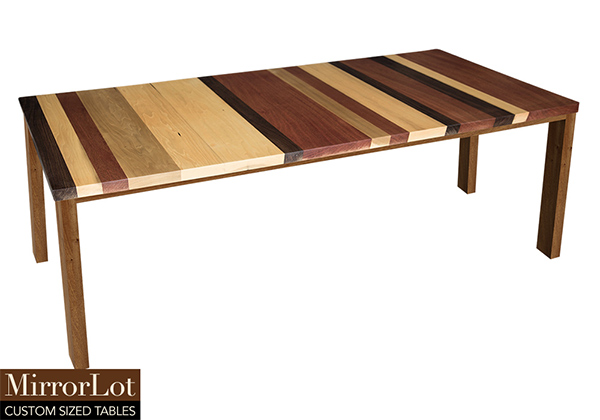 This mixed wood table is a combination natural mahogany, walnut, and poplar. It displays a contemporary design with a rustic flair. It is rectangular, but can be customized to your desired shape and size. The rectangle shape table top is made from solid walnut, mahogany, poplar wood and the table legs are