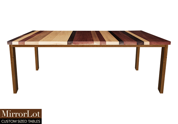 Wood & finish: Stripes of natural walnut, mahogany, and poplar table top and natural african mahogany table legs