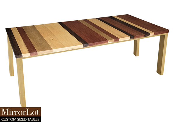 Wood & finish: Stripes of natural walnut, mahogany, and poplar table top and natural supreme alder table legs