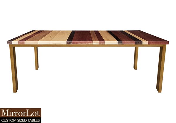 This mixed wood table is a combination natural mahogany, walnut, and poplar. It displays a contemporary design with a rustic flair. It is rectangular, but can be customized to your desired shape and size. The rectangle shape table top is made from solid walnut, mahogany, poplar wood and the table legs are