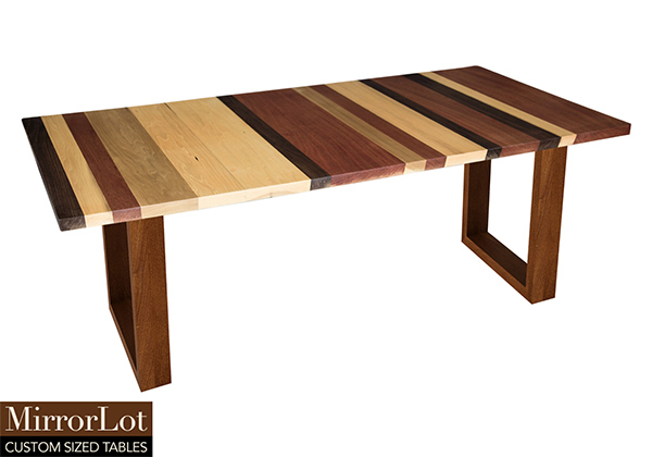 This mixed wood table is a combination natural mahogany, walnut, and poplar. It displays a contemporary design with a rustic flair. It is rectangular, but can be customized to your desired shape and size. The rectangle shape table top is made from solid walnut, mahogany, poplar wood and the table legs are