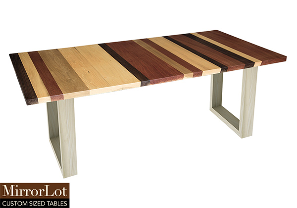 Wood & finish: Stripes of natural walnut, mahogany, and poplar table top and natural poplar table legs