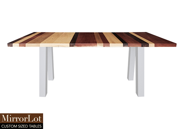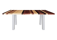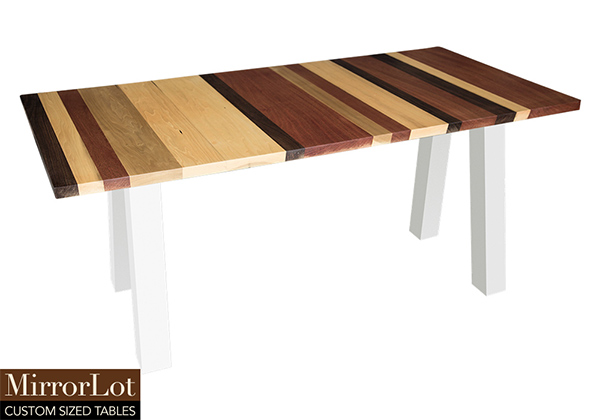 Wood & finish: Stripes of natural walnut, mahogany, and poplar table top and white table legs