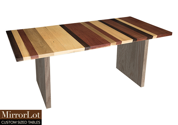 Wood & finish: Stripes of natural walnut, mahogany, and poplar table top and natural red oak table legs