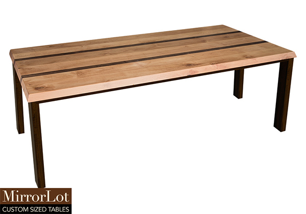 This natural alder and walnut table brings rustic charm to any room in your house. It is rectangular with a beveled edge, but can be customized to your desired shape and size. The rectangle shape table top is made from solid walnut, rustic alder wood and the table legs are
