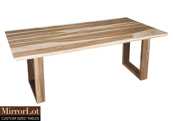 This pecan hickory solid wood table brings rustic charm to any room in your house. It is rectangular with 2 beveled edges on the two ends of the table and can be customized to your desired shape or size. The rectangle shape table top is made from solid pecan hickory wood and the table legs are
