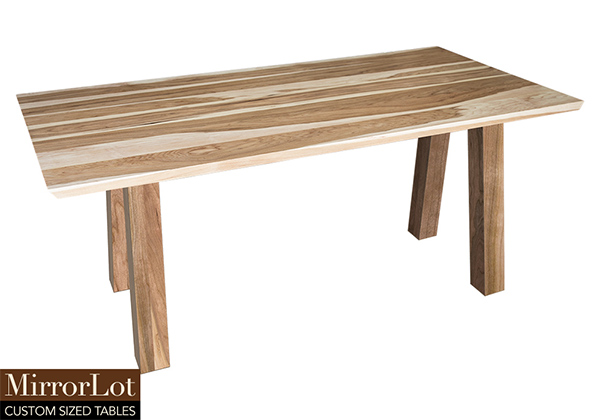 This pecan hickory solid wood table brings rustic charm to any room in your house. It is rectangular with 2 beveled edges on the two ends of the table and can be customized to your desired shape or size. The rectangle shape table top is made from solid pecan hickory wood and the table legs are