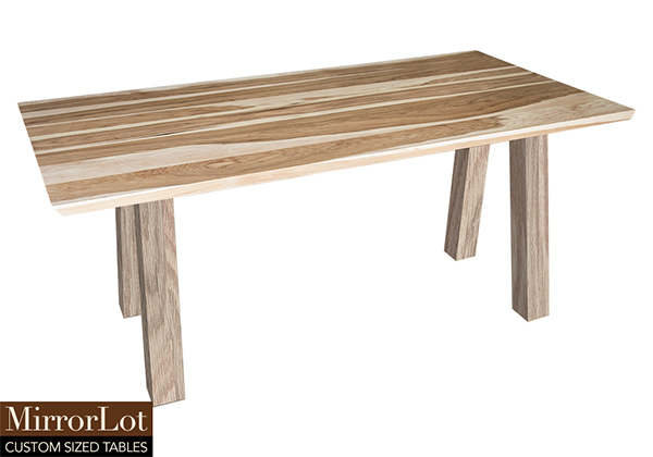 This pecan hickory solid wood table brings rustic charm to any room in your house. It is rectangular with 2 beveled edges on the two ends of the table and can be customized to your desired shape or size. The rectangle shape table top is made from solid pecan hickory wood and the table legs are