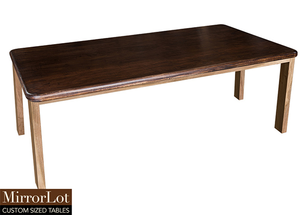 This bronze walnut stained table is simple, yet has a classic and rustic look that never goes out of style. It is rectangular with smooth rounded edges, but can customized to your desired shape and size. The rectangle shape table top is made from solid poplar wood and the table legs are