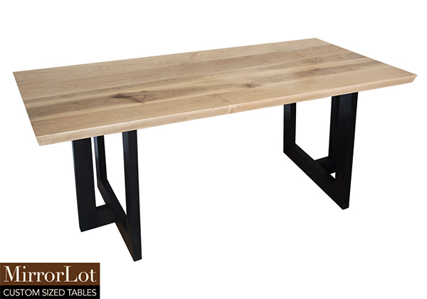 This natural maple table brings rustic charm to any room in your house. It is rectangular with a beveled edge, but can be customized to your desired shape and size. The rectangle shape table top is made from solid maple wood and the table legs are
