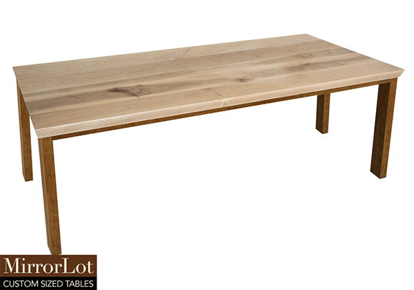 This natural maple table brings rustic charm to any room in your house. It is rectangular with a beveled edge, but can be customized to your desired shape and size. The rectangle shape table top is made from solid maple wood and the table legs are