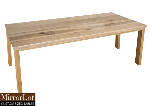 This natural maple table brings rustic charm to any room in your house. It is rectangular with a beveled edge, but can be customized to your desired shape and size. The rectangle shape table top is made from solid maple wood and the table legs are