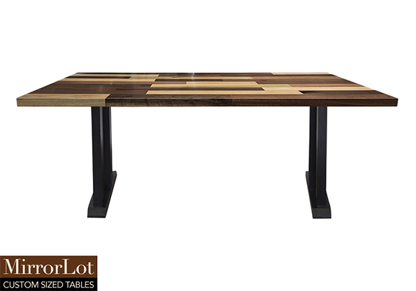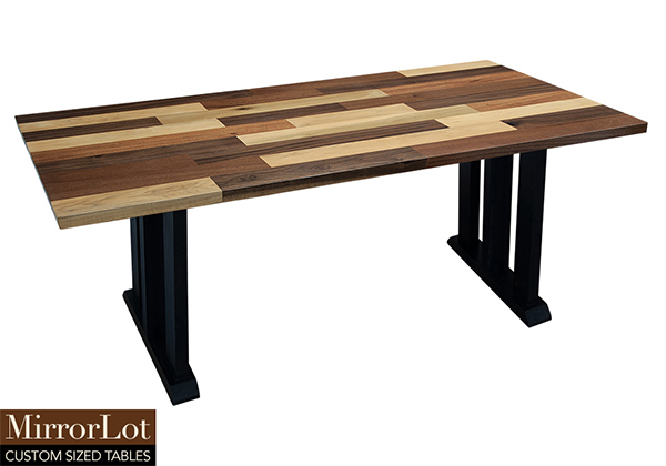 This mixed wood table is a combination solid mahogany, walnut, and poplar wood. It displays a contemporary design with a rustic flair. It is rectangular, but can be customized to your desired shape and size. The rectangle shape table top is made from solid walnut, mahogany, poplar wood and the table legs are