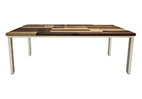 This mixed wood table is a combination solid mahogany, walnut, and poplar wood. It displays a contemporary design with a rustic flair. It is rectangular, but can be customized to your desired shape and size. The rectangle shape table top is made from solid walnut, mahogany, poplar wood and the table legs are