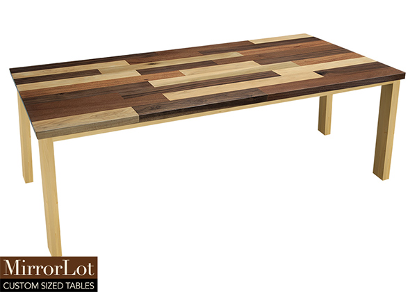 This mixed wood table is a combination solid mahogany, walnut, and poplar wood. It displays a contemporary design with a rustic flair. It is rectangular, but can be customized to your desired shape and size. The rectangle shape table top is made from solid walnut, mahogany, poplar wood and the table legs are
