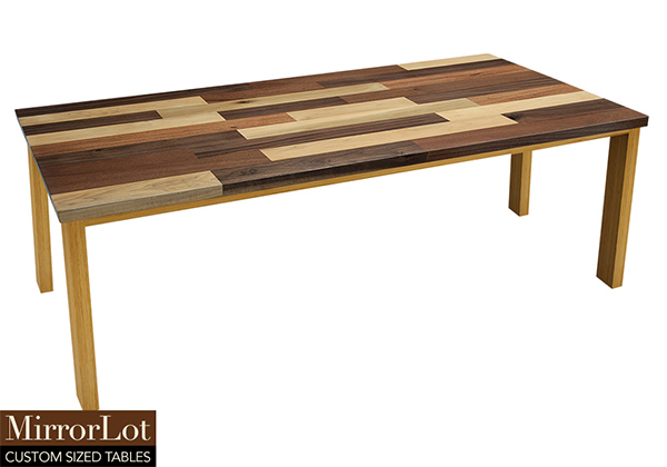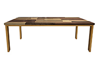 This mixed wood table is a combination solid mahogany, walnut, and poplar wood. It displays a contemporary design with a rustic flair. It is rectangular, but can be customized to your desired shape and size. The rectangle shape table top is made from solid walnut, mahogany, poplar wood and the table legs are