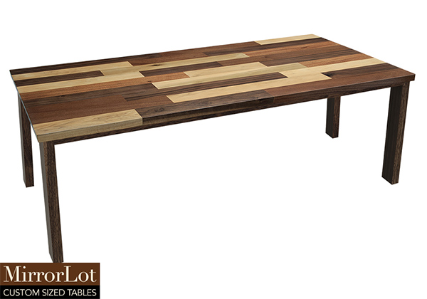 This mixed wood table is a combination solid mahogany, walnut, and poplar wood. It displays a contemporary design with a rustic flair. It is rectangular, but can be customized to your desired shape and size. The rectangle shape table top is made from solid walnut, mahogany, poplar wood and the table legs are