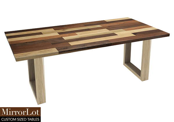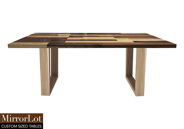 This mixed wood table is a combination solid mahogany, walnut, and poplar wood. It displays a contemporary design with a rustic flair. It is rectangular, but can be customized to your desired shape and size. The rectangle shape table top is made from solid walnut, mahogany, poplar wood and the table legs are