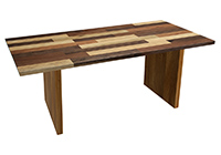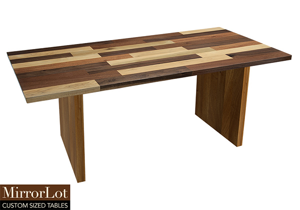 This mixed wood table is a combination solid mahogany, walnut, and poplar wood. It displays a contemporary design with a rustic flair. It is rectangular, but can be customized to your desired shape and size. The rectangle shape table top is made from solid walnut, mahogany, poplar wood and the table legs are