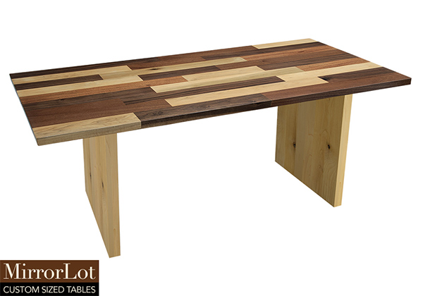 This mixed wood table is a combination solid mahogany, walnut, and poplar wood. It displays a contemporary design with a rustic flair. It is rectangular, but can be customized to your desired shape and size. The rectangle shape table top is made from solid walnut, mahogany, poplar wood and the table legs are