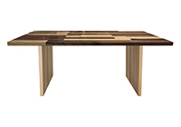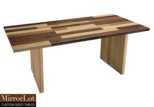 This mixed wood table is a combination solid mahogany, walnut, and poplar wood. It displays a contemporary design with a rustic flair. It is rectangular, but can be customized to your desired shape and size. The rectangle shape table top is made from solid walnut, mahogany, poplar wood and the table legs are