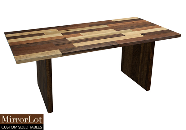 This mixed wood table is a combination solid mahogany, walnut, and poplar wood. It displays a contemporary design with a rustic flair. It is rectangular, but can be customized to your desired shape and size. The rectangle shape table top is made from solid walnut, mahogany, poplar wood and the table legs are
