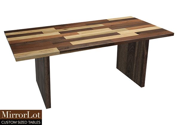 This mixed wood table is a combination solid mahogany, walnut, and poplar wood. It displays a contemporary design with a rustic flair. It is rectangular, but can be customized to your desired shape and size. The rectangle shape table top is made from solid walnut, mahogany, poplar wood and the table legs are