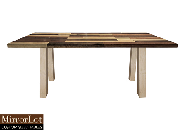 This mixed wood table is a combination solid mahogany, walnut, and poplar wood. It displays a contemporary design with a rustic flair. It is rectangular, but can be customized to your desired shape and size. The rectangle shape table top is made from solid walnut, mahogany, poplar wood and the table legs are