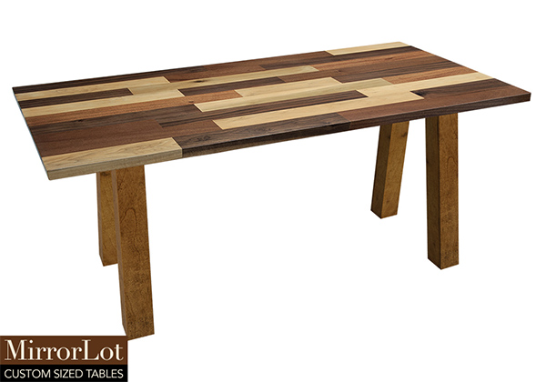 This mixed wood table is a combination solid mahogany, walnut, and poplar wood. It displays a contemporary design with a rustic flair. It is rectangular, but can be customized to your desired shape and size. The rectangle shape table top is made from solid walnut, mahogany, poplar wood and the table legs are