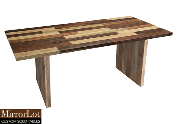 This mixed wood table is a combination solid mahogany, walnut, and poplar wood. It displays a contemporary design with a rustic flair. It is rectangular, but can be customized to your desired shape and size. The rectangle shape table top is made from solid walnut, mahogany, poplar wood and the table legs are