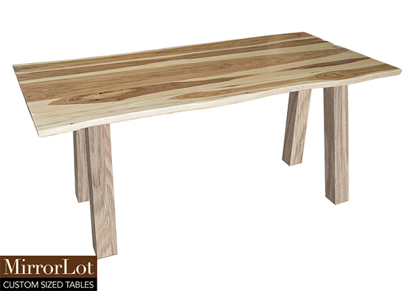 This natural pecan hickory table brings rustic charm to any room in your house. It is rectangular with a live edge, but can be customized to your desired shape and size. The live edge shape table top is made from solid pecan hickory wood and the table legs are