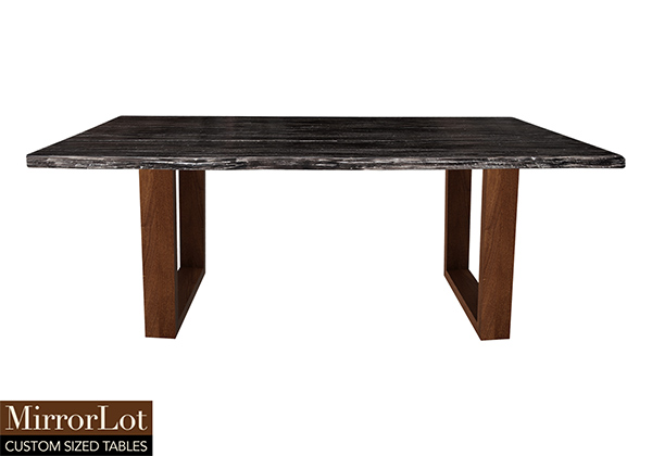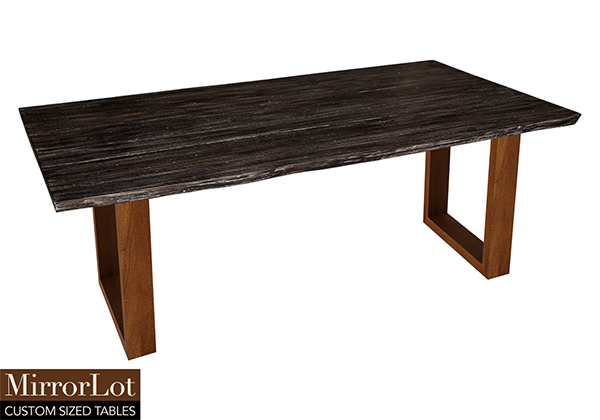 This dark rustic table with white reclaimed texture brings rustic charm to any room in your house. It is rectangular with a live edge, but can be customized to your desired shape and size. The live edge shape table top is made from solid poplar wood and the table legs are
