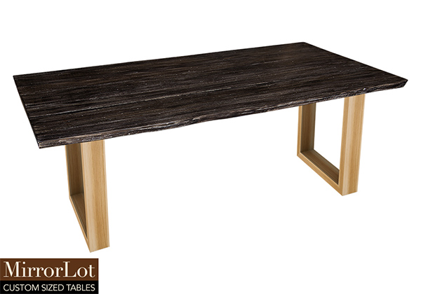 This dark rustic table with white reclaimed texture brings rustic charm to any room in your house. It is rectangular with a live edge, but can be customized to your desired shape and size. The live edge shape table top is made from solid poplar wood and the table legs are