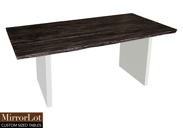 This dark rustic table with white reclaimed texture brings rustic charm to any room in your house. It is rectangular with a live edge, but can be customized to your desired shape and size. The live edge shape table top is made from solid poplar wood and the table legs are
