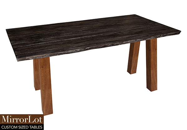 This dark rustic table with white reclaimed texture brings rustic charm to any room in your house. It is rectangular with a live edge, but can be customized to your desired shape and size. The live edge shape table top is made from solid poplar wood and the table legs are