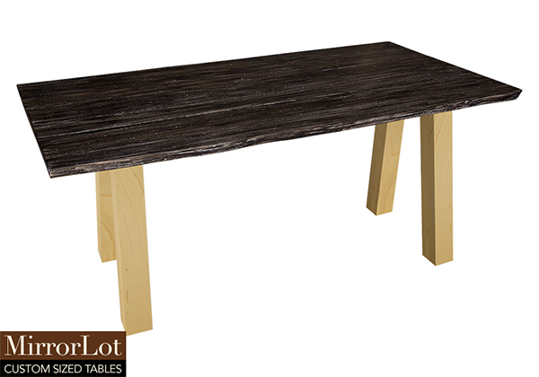 This dark rustic table with white reclaimed texture brings rustic charm to any room in your house. It is rectangular with a live edge, but can be customized to your desired shape and size. The live edge shape table top is made from solid poplar wood and the table legs are
