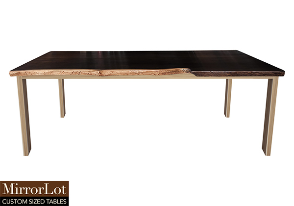 This dark espresso stained table brings rustic charm to any room in your house. It is rectangular with a bronze live edge, but can be customized to your desired shape and size. The live edge shape table top is made from solid poplar wood and the table legs are