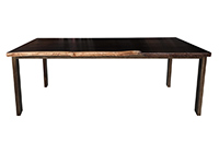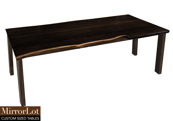 This dark espresso stained table brings rustic charm to any room in your house. It is rectangular with a bronze live edge, but can be customized to your desired shape and size. The live edge shape table top is made from solid poplar wood and the table legs are