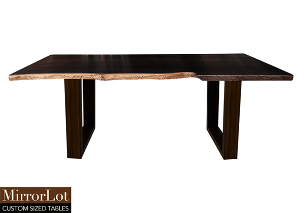 This dark espresso stained table brings rustic charm to any room in your house. It is rectangular with a bronze live edge, but can be customized to your desired shape and size. The live edge shape table top is made from solid poplar wood and the table legs are