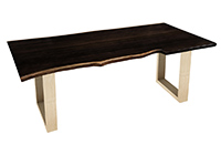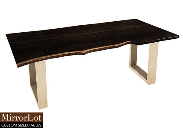 This dark espresso stained table brings rustic charm to any room in your house. It is rectangular with a bronze live edge, but can be customized to your desired shape and size. The live edge shape table top is made from solid poplar wood and the table legs are
