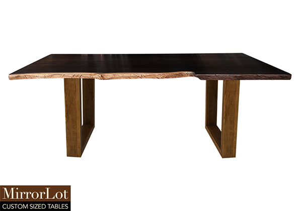 This dark espresso stained table brings rustic charm to any room in your house. It is rectangular with a bronze live edge, but can be customized to your desired shape and size. The live edge shape table top is made from solid poplar wood and the table legs are
